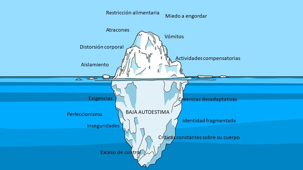 Cuando trabajamos los TCA como una enfermedad mental se utiliza la metáfora del iceberg, explicando cómo funciona la patología, dicha explicación también es dada al individuo tratante o la red de apoyo, en la siguiente imagen podrás ver la metáfora del iceberg.